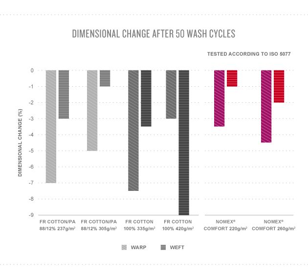 Garments made of Nomex® fibres help offer better strength and lower shrinkage after washing and drying than FR cotton. This can lead to an excellent appearance over a longer lifetime.