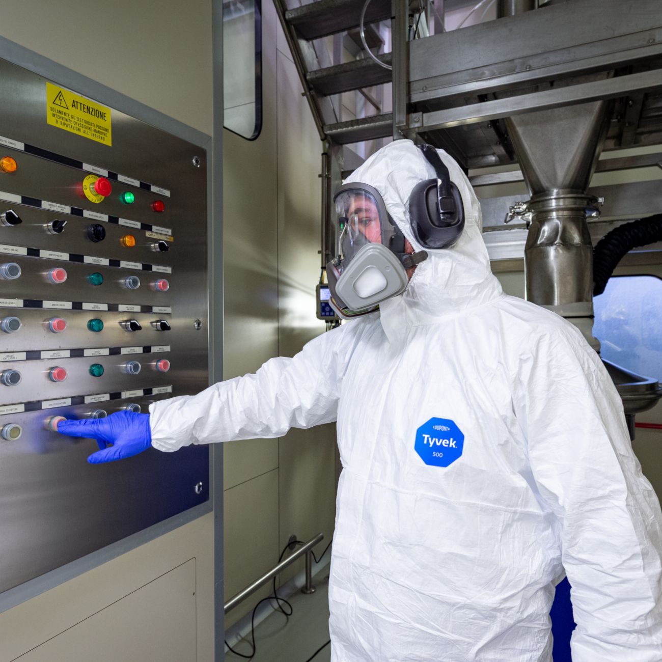 Risk assessments identified that workers in the High Potency API Synthesis Department (R- HP) and related laboratories required personal protection against dust exposure. This also applied to operators in the Finishing Department (RP) and those involved in loading and unloading powdered solid products across all production areas. In addition, maintenance workers required protection from the acidic and aggressive cleaning agents necessary to uphold strict levels of hygiene.