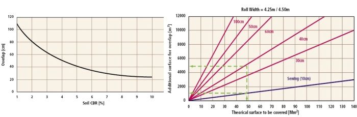 The two following graphs show the amount of extra DuPont™ Typar® needed, depending on the calculated surface area and the overlap width.
