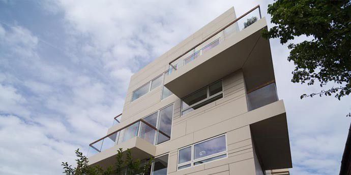 Architect Jo Hagan, who has been keenly involved for many years in the regeneration of local neighbourhoods such as his own community of Hackney, describes the concept behind the project: “There is certainly an element of homage to the Bauhaus in the overall design, and the façade and its relationship to the windows and balconies is the only element of decoration. The concept is inspired by the book Fahrenheit 451 by Raymond Bradbury and so we have used a 4.5.1. ratio for the various panels.”