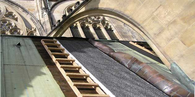 In May of 2011, the reconstruction of the copper roof above St. Wenceslas Chapel was completed. Following a careful market research, the DuPont™Tyvek® Metal advanced membrane was chosen for increased protection. First, the original copper plates were removed and, before placing of a new, artificially patined copper roof, the DuPont™ Tyvek® Metal vapour open membrane was installed on timber formwork into the roof structure. The purpose of the membrane was to increase weather protection of the chapel and prevent condensed moisture from penetrating into the roof structure.
