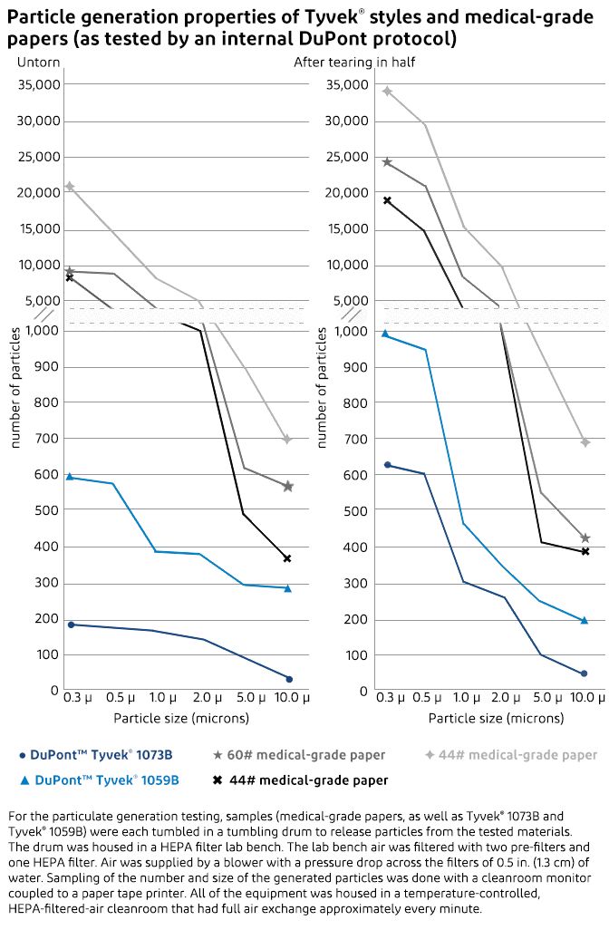 Particulate generation tests comparing Tyvek® to medical-grade papers showed conclusively that Tyvek® is a low lint packaging material that generates far fewer airborne particulates that could contaminate the medical device or the sterile field. The particulate generation testing measured the quantity and size of particles generated by Tyvek® and medical-grade paper both before and after being torn in half.