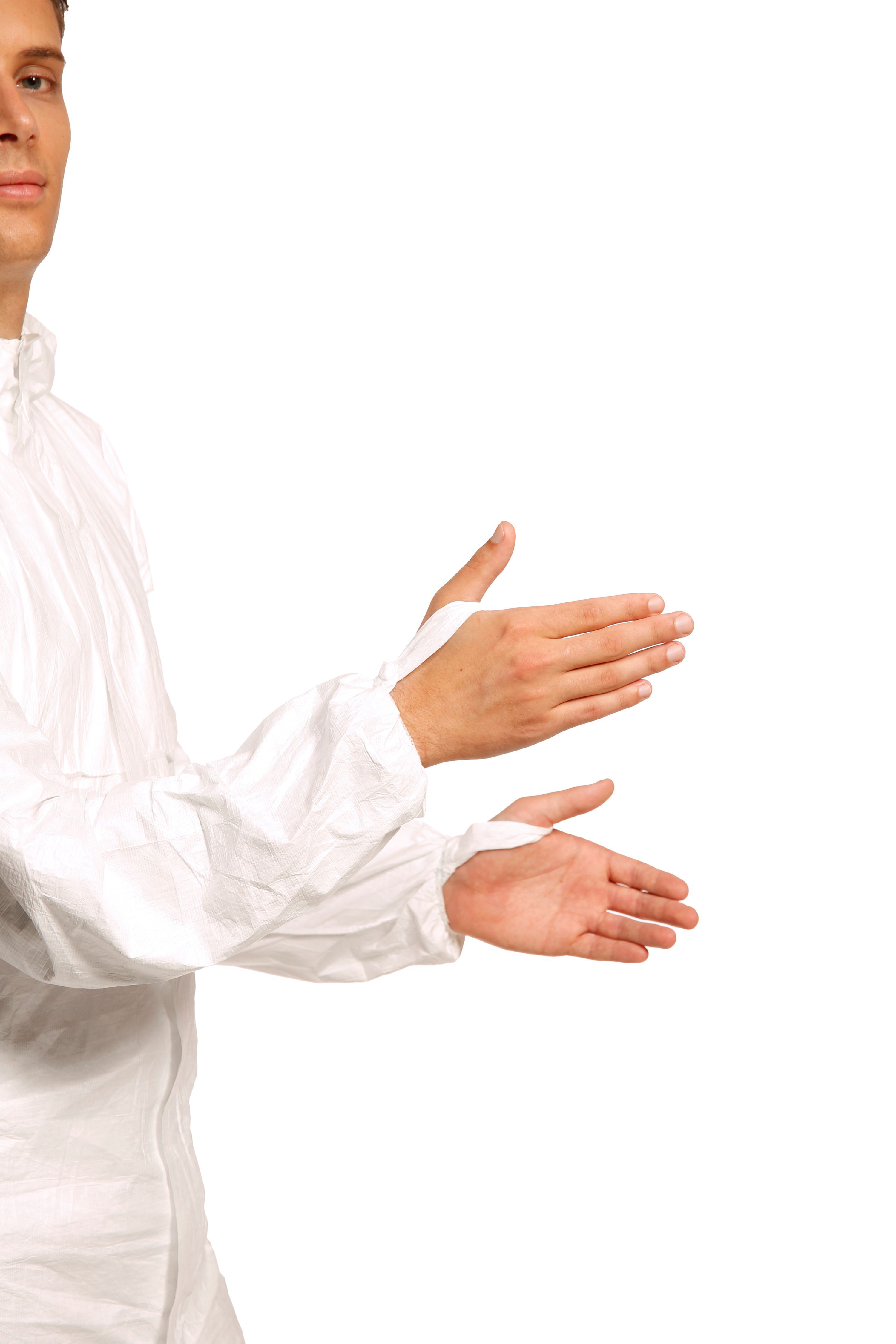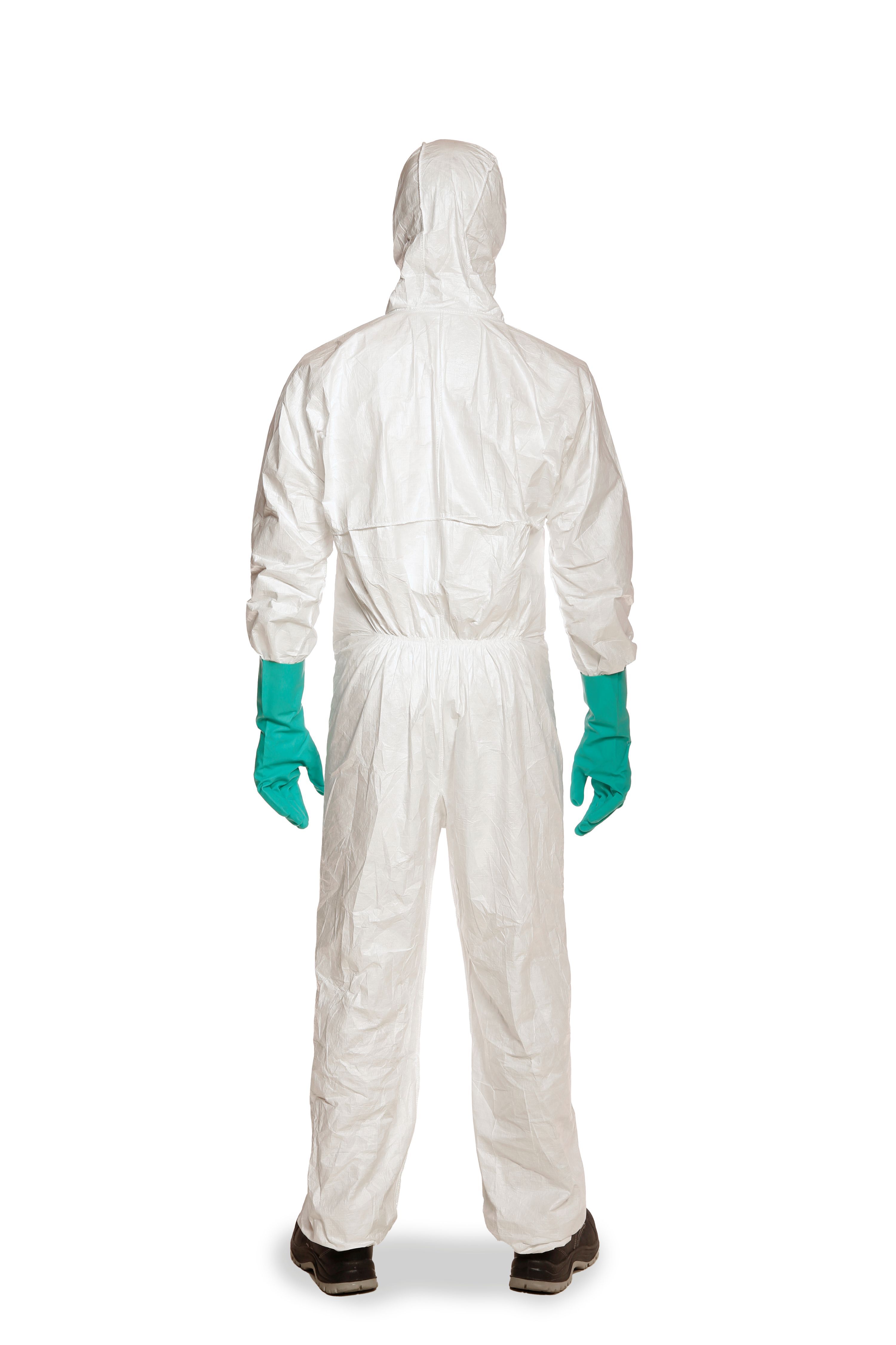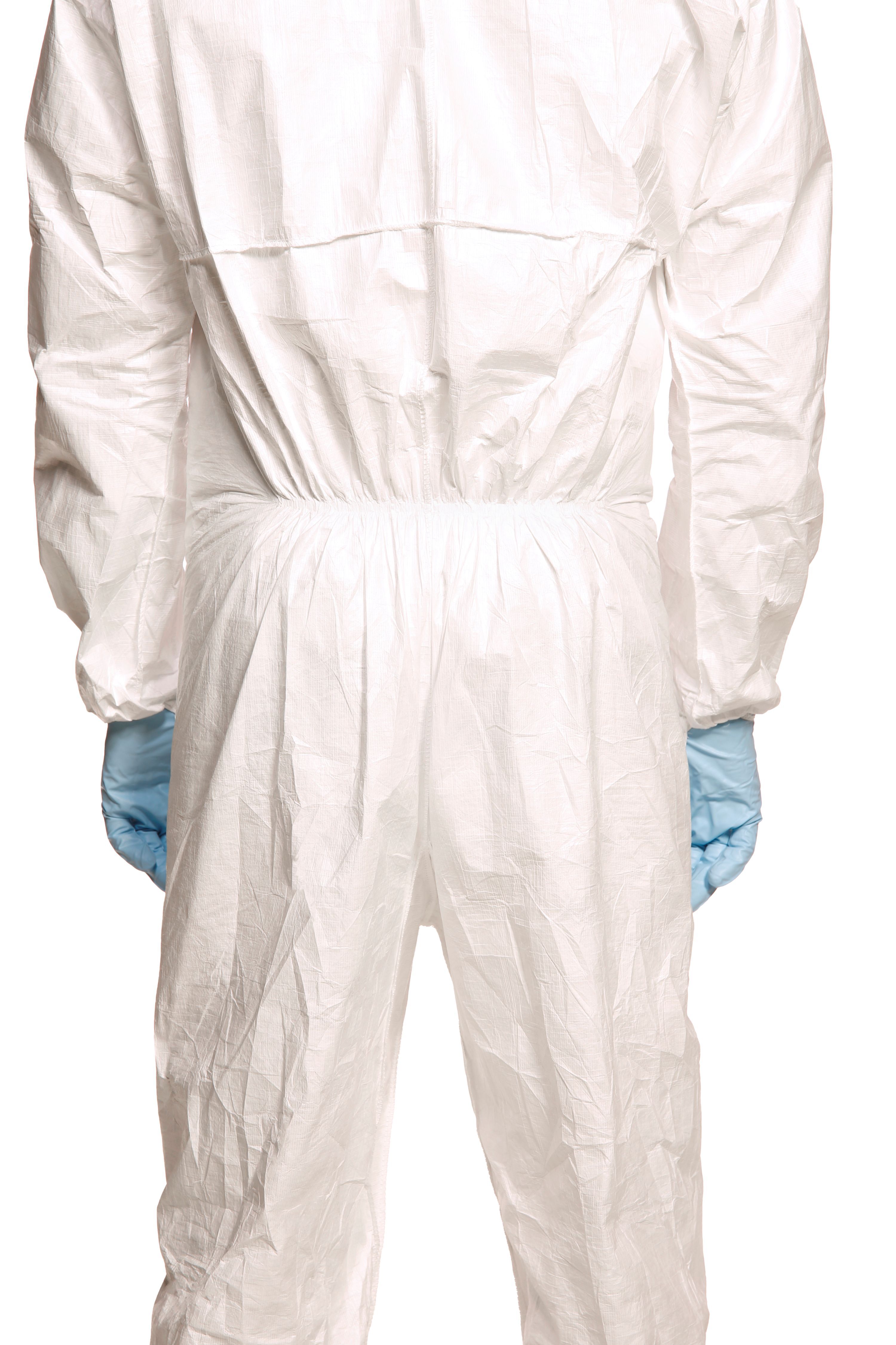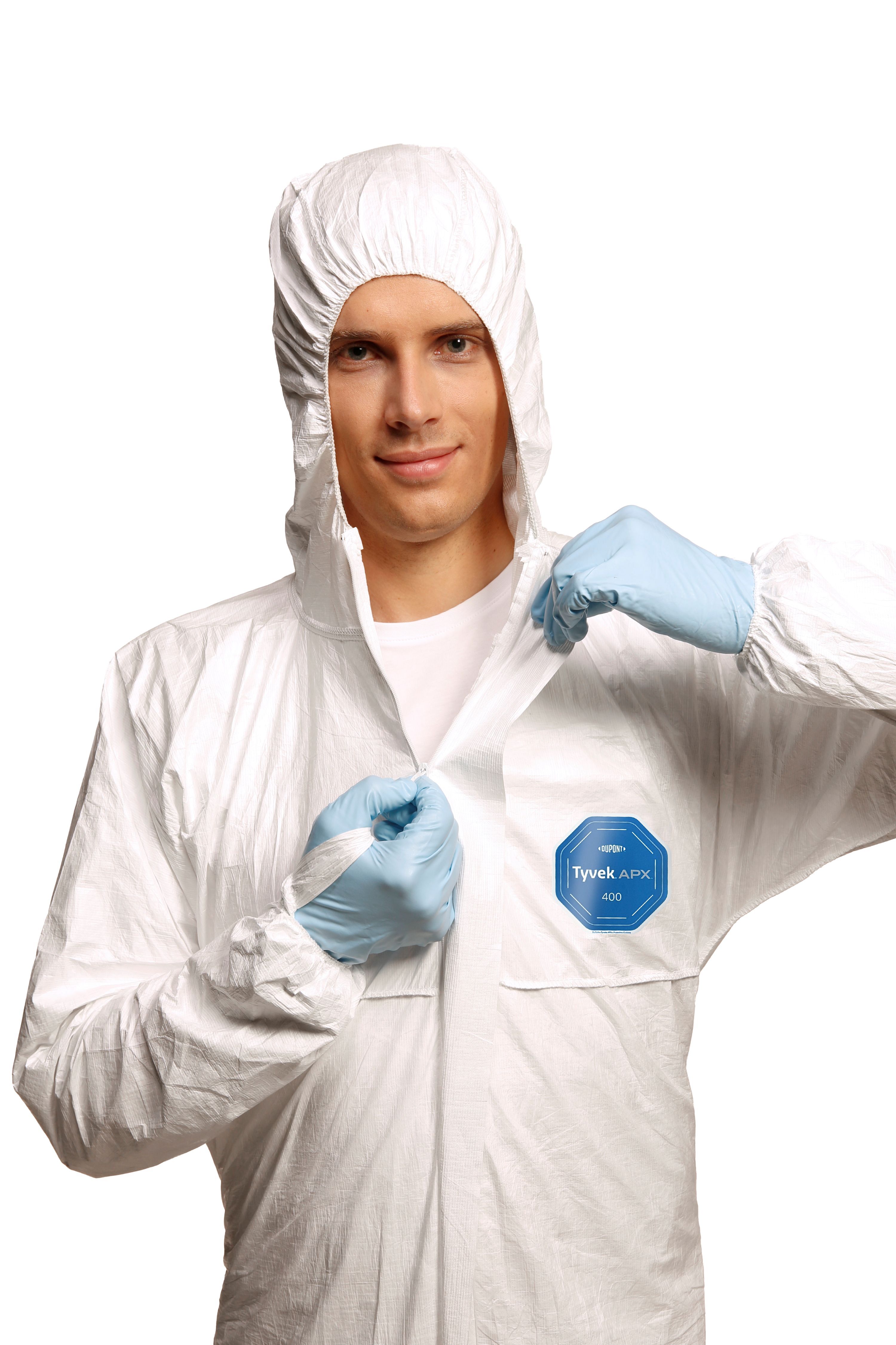 DuPont™ Tyvek® APX™ 400 TA198S. New generation of Tyvek® for PPE. Robust yet lightweight protection providing a barrier against fine particles and low-level sprays in an extremely breathable white hooded coverall made with the innovative new Tyvek® APX™ fabric. Features stitched external seams, a respirator fit three-piece hood, thumb loops, an ergonomic design, elasticated wrists, ankles, face, and waist (glued-in) and a Tyvek® zipper with a pin lock slider zipper pull and a storm flap. Suitable for a variety of applications including pharmaceutical handling, chemical processing, general maintenance, and spray painting.