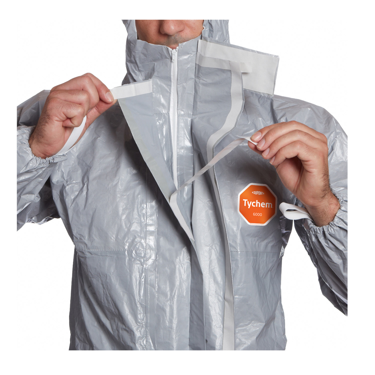 DuPont™ Tychem® 6000 F Grey. Hooded coverall. Stitched and over-taped seams. Thumb loops. Elastication at wrists, ankles, face and waist. Self-adhesive double zipper flap and chin flap. Grey.